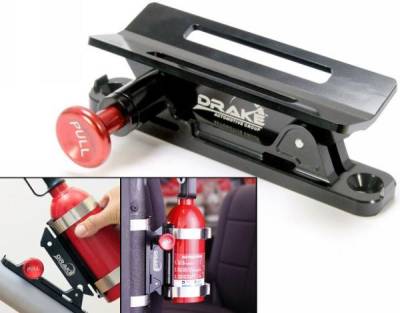 Every vehicle should have a fire extinguisher properly stored in it for emergencies. It doesn’t matter if it’s a race car or a daily driver – having a fire extinguisher handy can be a life saver. Drake Automotive Group has the perfect solution with this NHRA approved quick release fire extinguisher mount. The innovative design of this mount offers solid and secure fire extinguisher storage with quick access when needed. This mount features CNC machined 6061-T6 billet aluminum construction with a red anodized quick release pull knob.