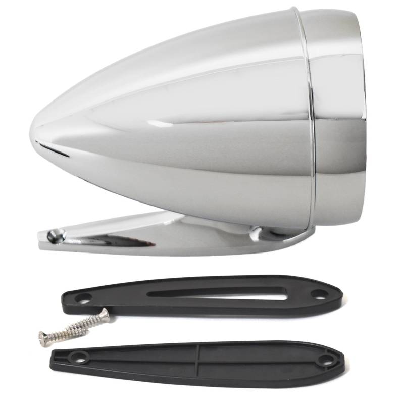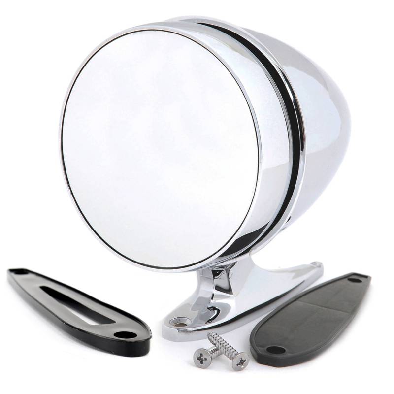 - Factory-correct reproduction assembly with chrome finish and bullet shaped round mirror housing